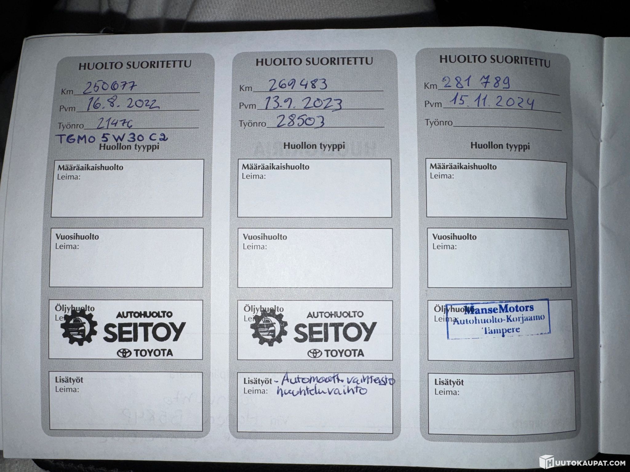 Autoa huollettu kun tarve ollut kuvissa näkyy huoltokirjasta kuva.