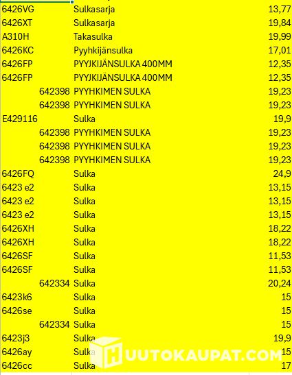 Mukana mm. lokasuojaa, puskureita, taka-akselia suodattimia ja pyyhkijänsulkia.