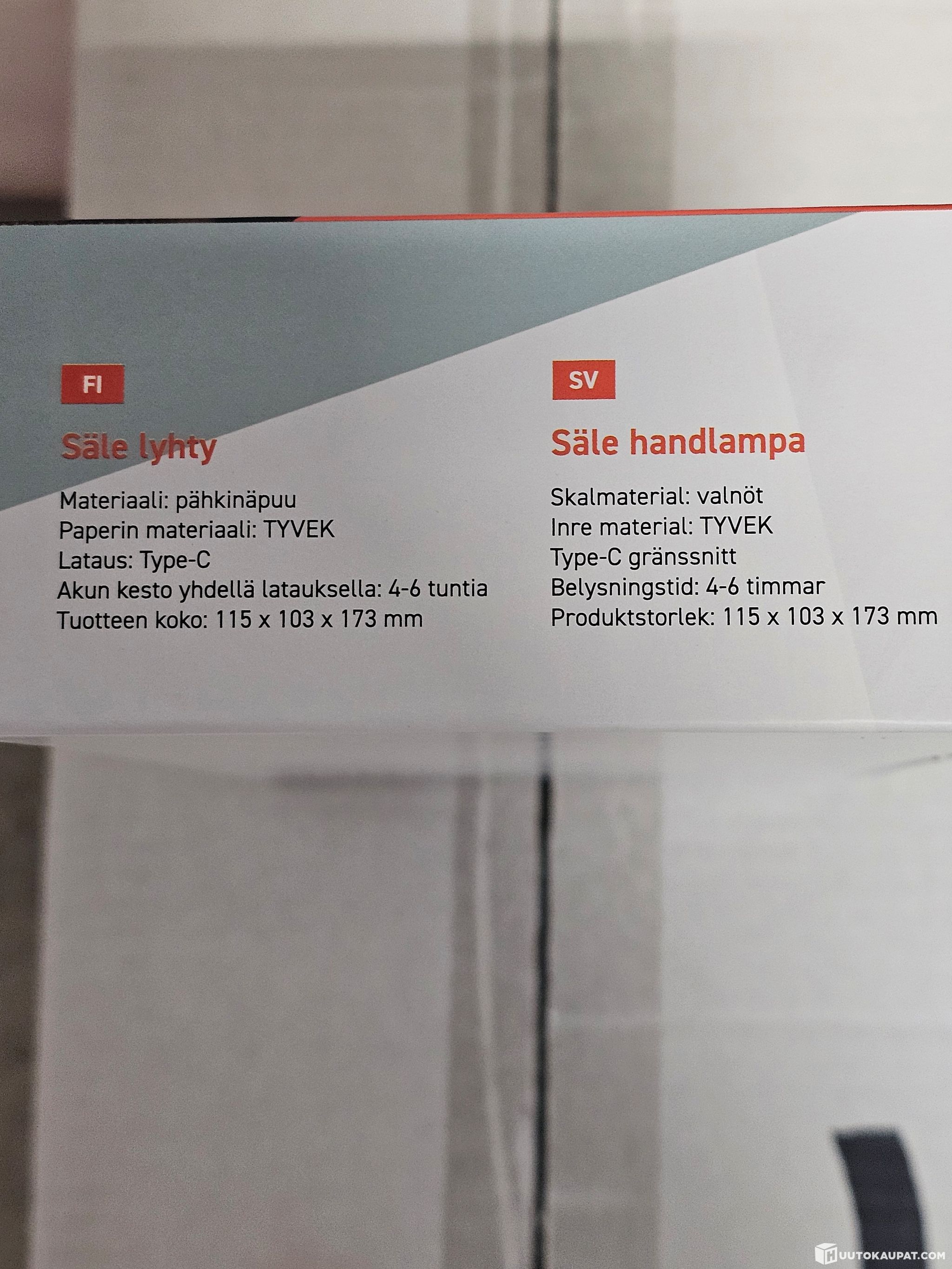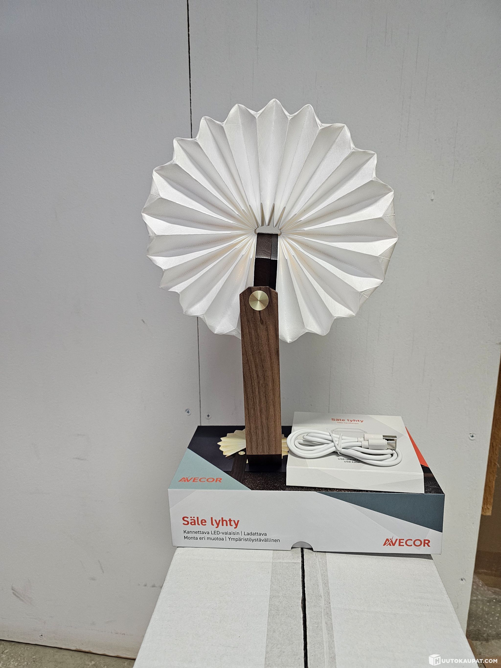 Säle lyhty pöytävalaisin 30 kpl, materiaali TYVEK-paperi, väriltään luonnonvalkoinen, runko pähkinäpuuta. Varustettu USB-C-liitännällä ja ladattavalla akulla, jonka kesto on 4-6 tuntia. Mitat 115 x 103 x 173 mm. Latausjohdot mukana