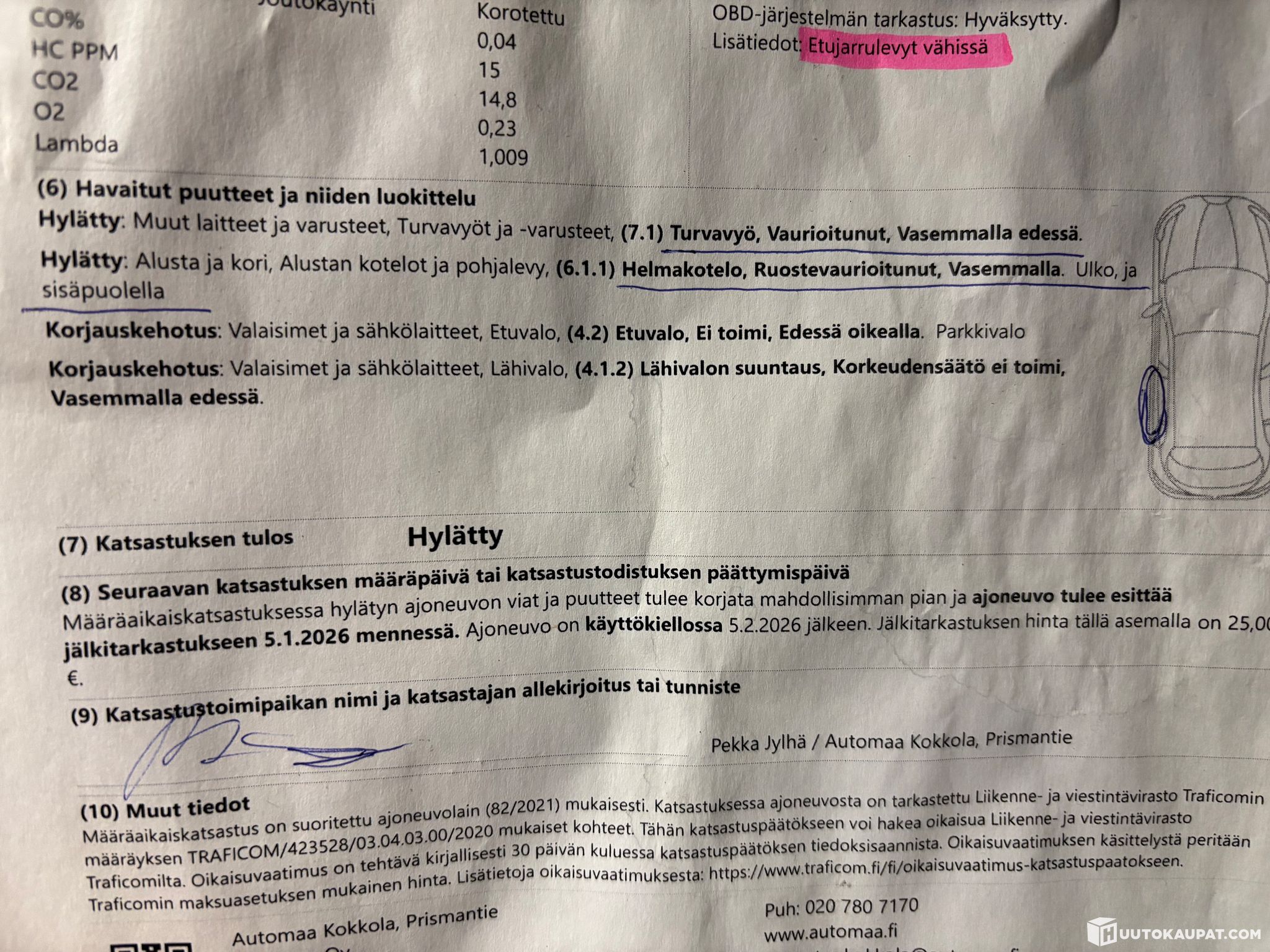 Auto ollut 4-henkisen perheen arkipäiväisessä käytössä mutta jää nyt korjaamatta hylätyn katsastuspäätöksen takia.