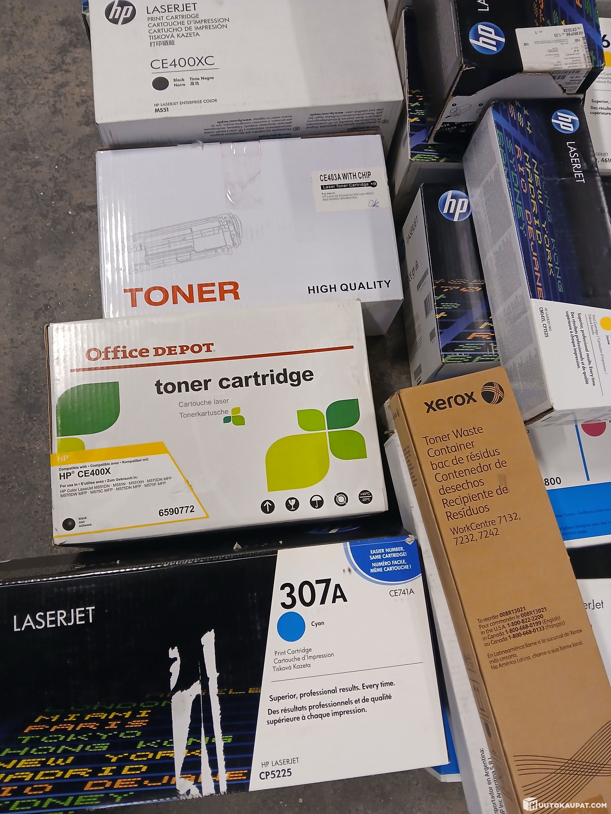 Erä tulostinmusteita ja värikasetteja pakattu EUR-lavalle.