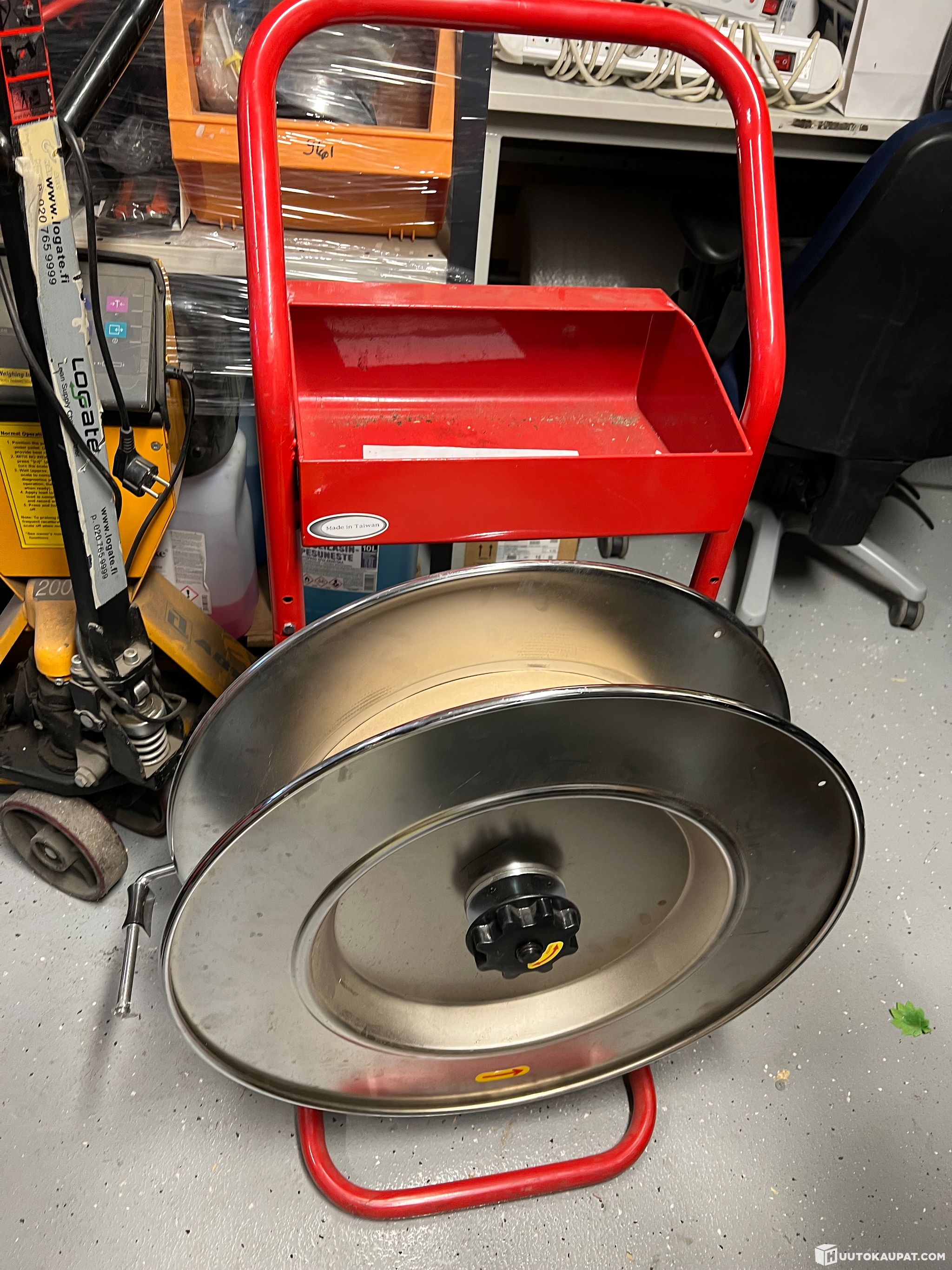 Punaiseksi jauhemaalattu teräsrunko kestää varaston kolhut ja ulkovarastoinnin säävaihtelut. Suuret pyörät rullaavat kevyesti epätasaisellakin betonilla, joten rulla seuraa käyttäjää sujuvasti kuormalta toiselle.
